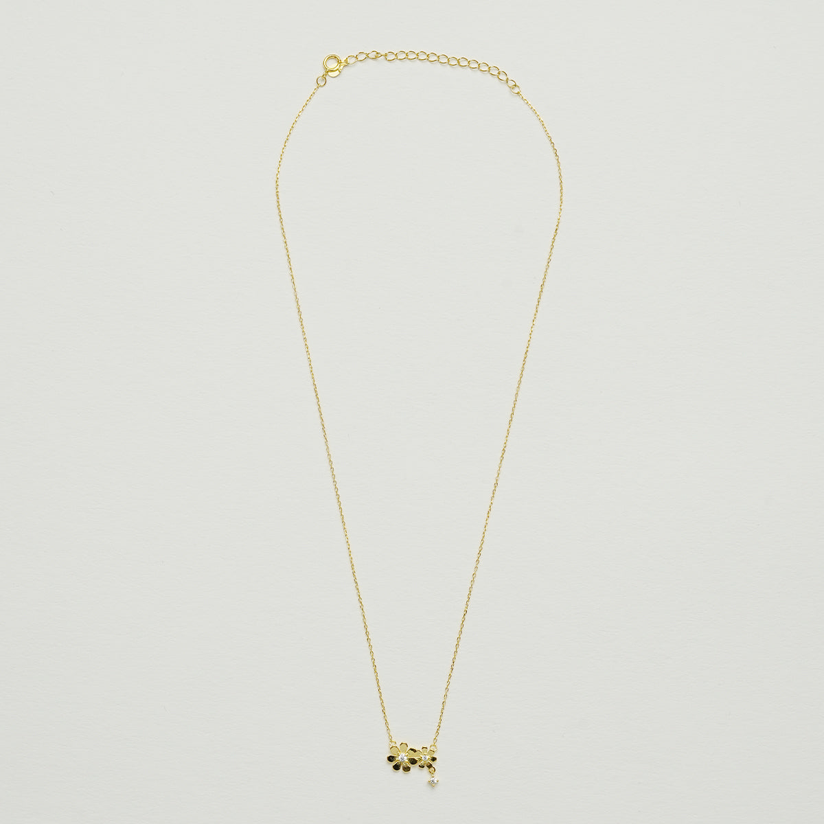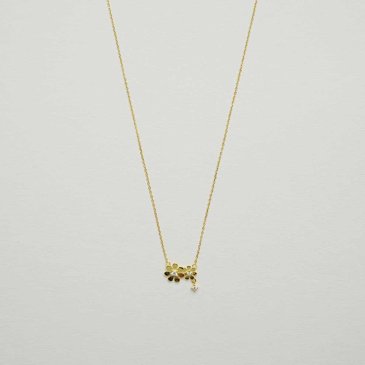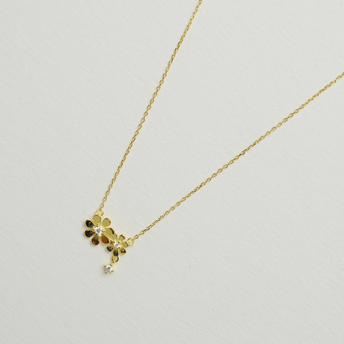 ネックレスのチェーンは、高品質の 925シルバーの純銀製であり、厚いゴールドメッキ処理を施されています。これにより、より光沢が出るだけでなく、持つ事のできる耐久性も増しています。ペンダント部分には、2つの精巧なマーガレットの花がデザインされています。それぞれの花は、生き生きとした、春の息吹を感じるような形で、首に跃動します。
